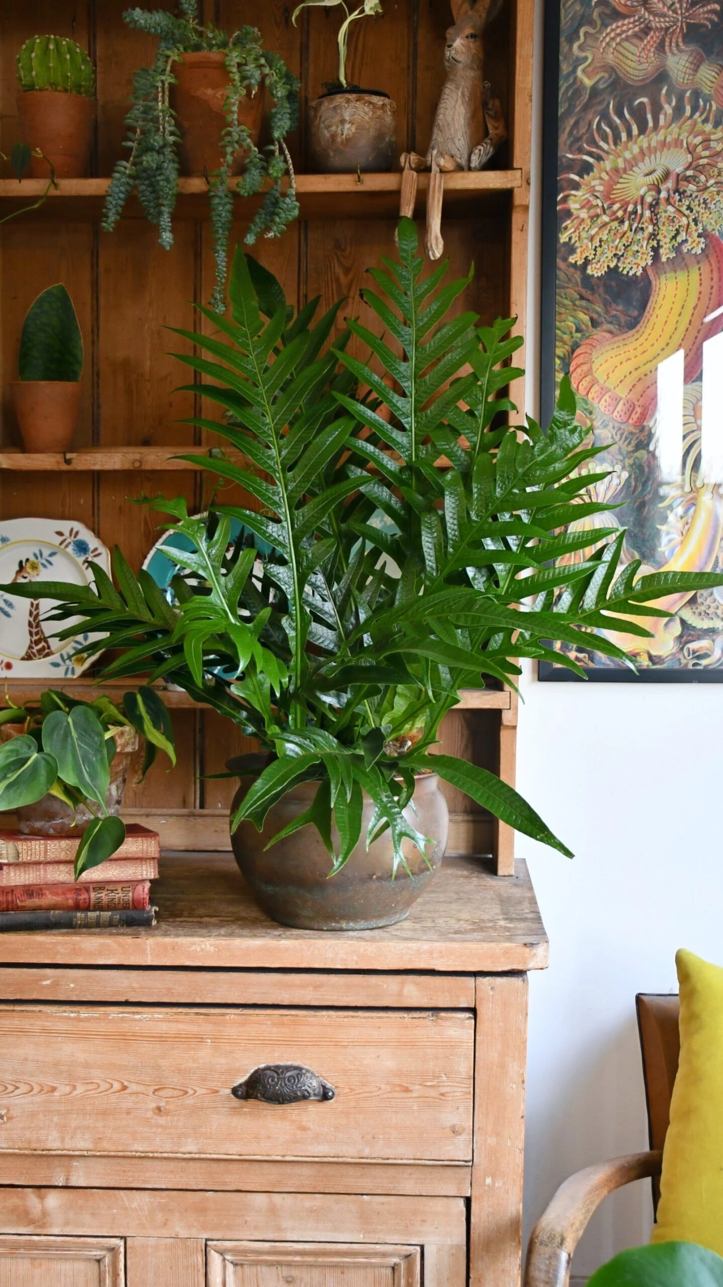 Aglaomorpha Coronans – Snake Leaf Ferns are wonderful and very much in fashion. We love this because it conjures up images of the lush rainforest floor (and Dinosaurs!). Aglaomorpha Coronans is in our view the prettiest of all the indoor ferns, with glossy large leaves and classically shaped leaves. These are relatively slow growers so we only sell the large mature form which shows the fern in all its glory.Â