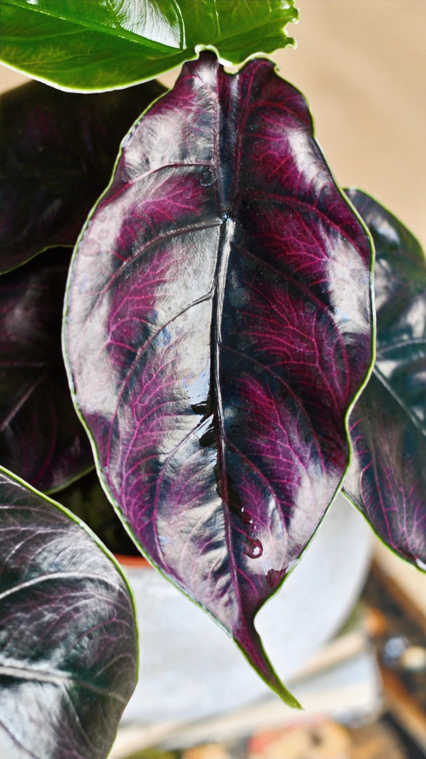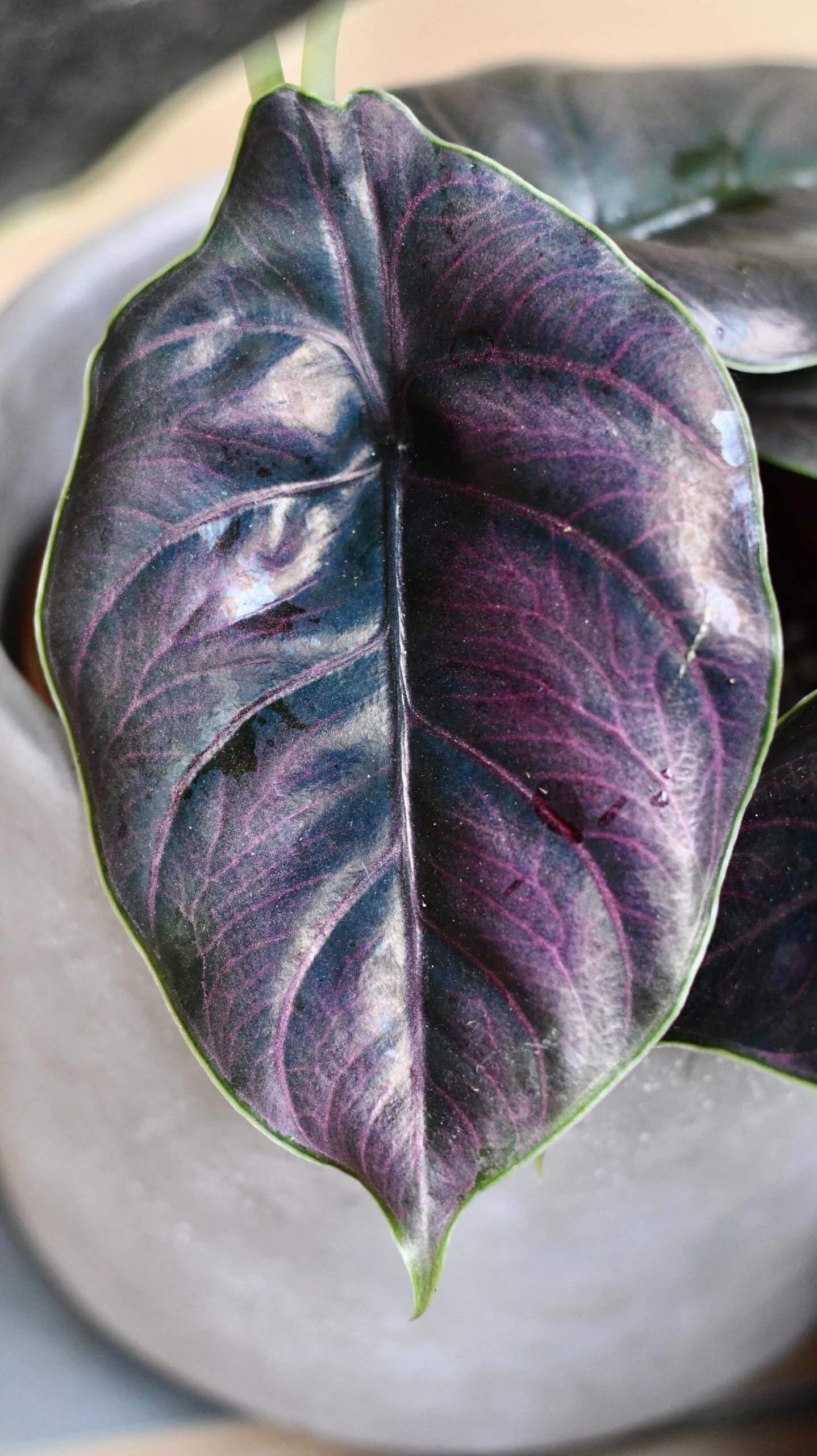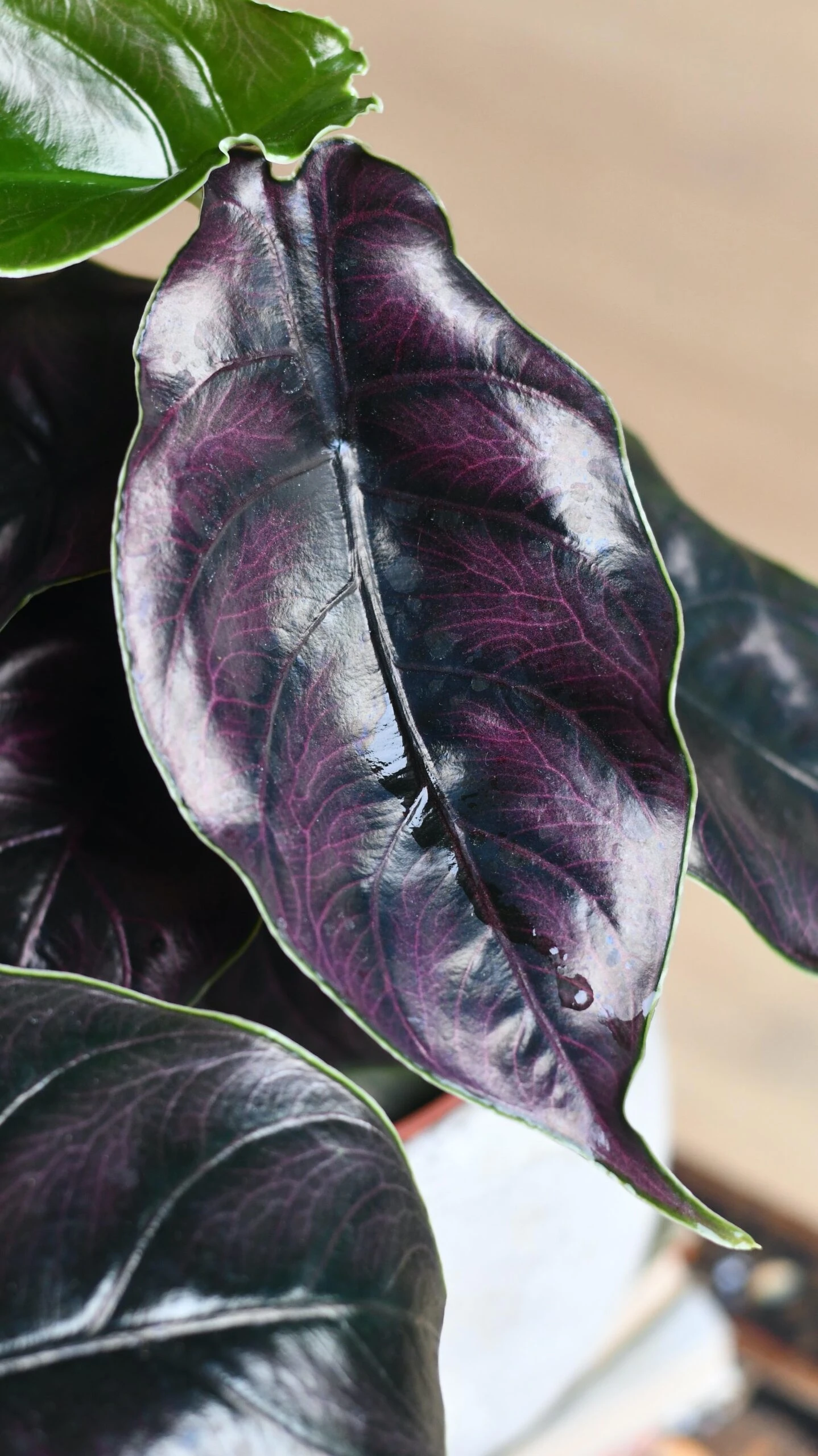 New leaves will slowly unfurl and are green with purple veins that turn waxy, deep iridescent green with dark purple veins with a beautiful green outline, and a purple underside.