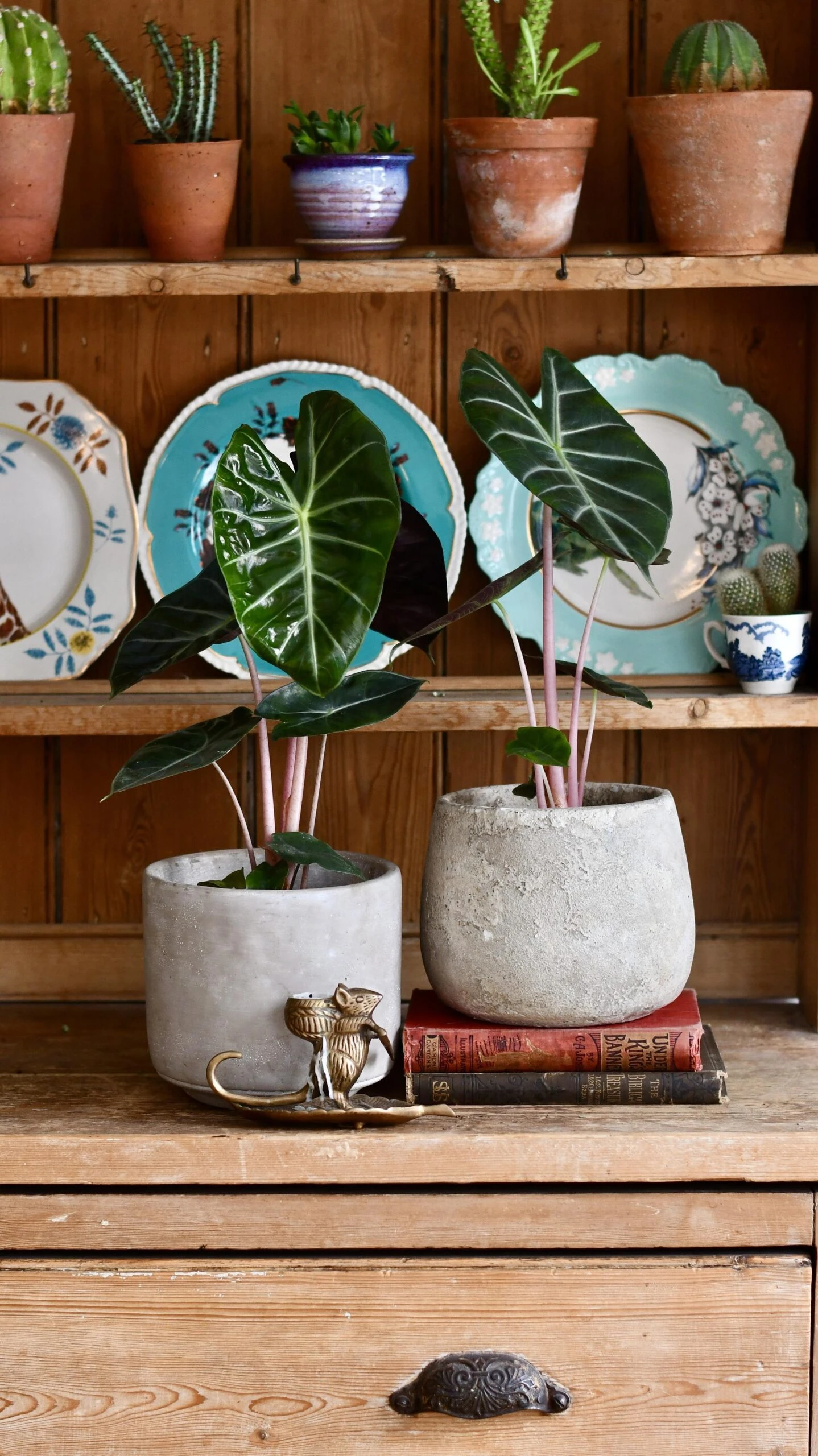 The Pink Dragon likes bright, filtered light, away from direct sun. The leaves are prone to getting sunburnt and will start to look dull if exposed to the sun. Coming from a tropical environment, these Alocasias like humidity, sit on a tray of pebbles topped up with water to boost the level of moisture in the air. Keep the leaves dust-free and mist them every once in a while.