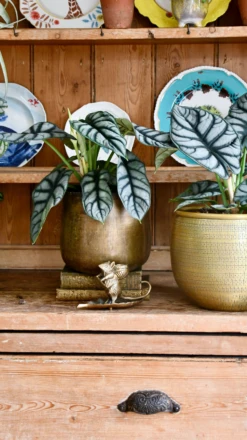 Featured here in our beautiful 23cm tembesi planter, handcrafted from aluminium and finished in a warm brass hue, the collection is ideal for house plants, cacti and succulents. The etched detailing on the exterior is all made by hand and gives this eye-catching collection a real point of difference.