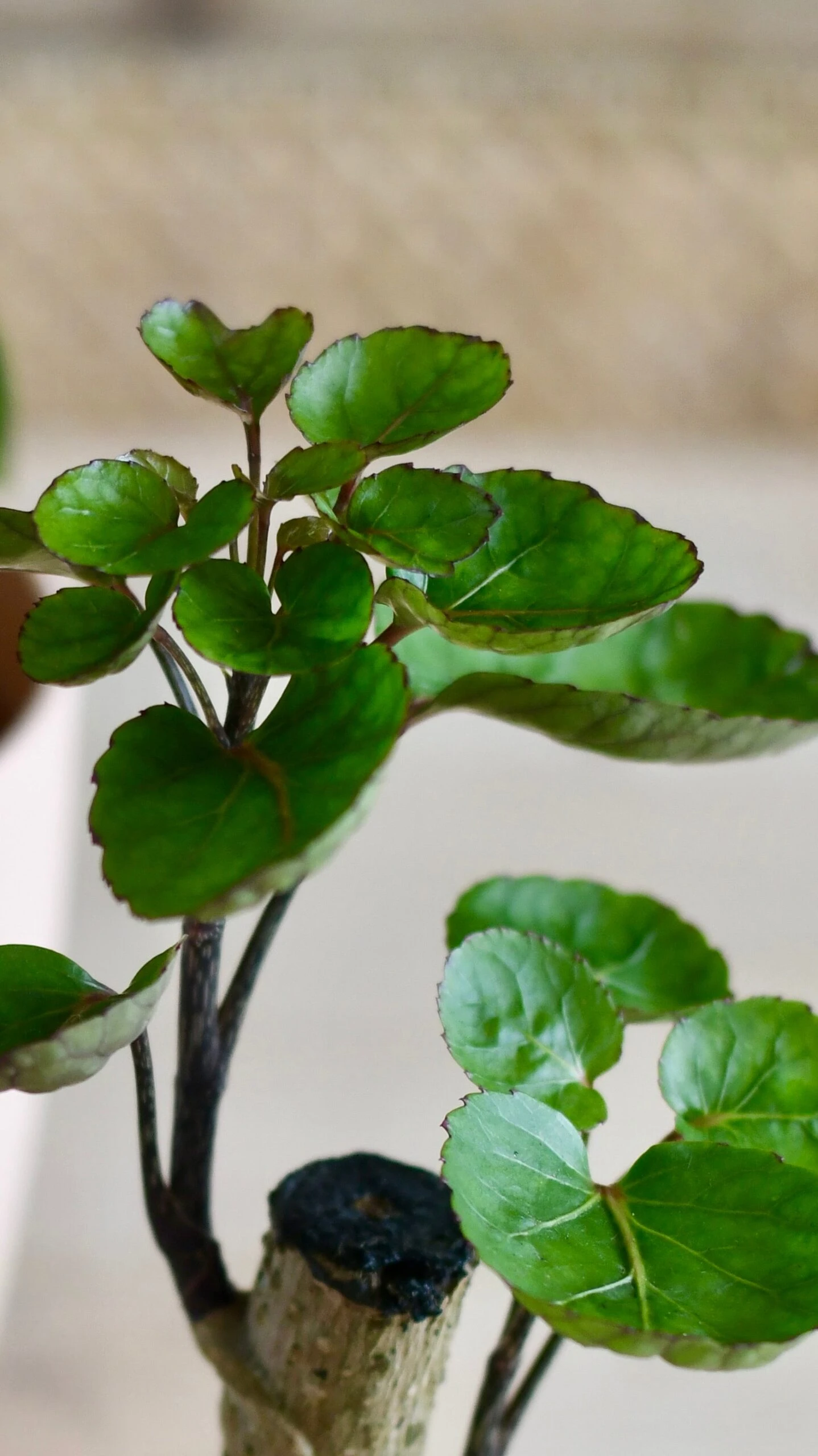 The purple-green, round leaves grow across the entire branch. A perfect houseplant if you have a shady spot in your home or office.