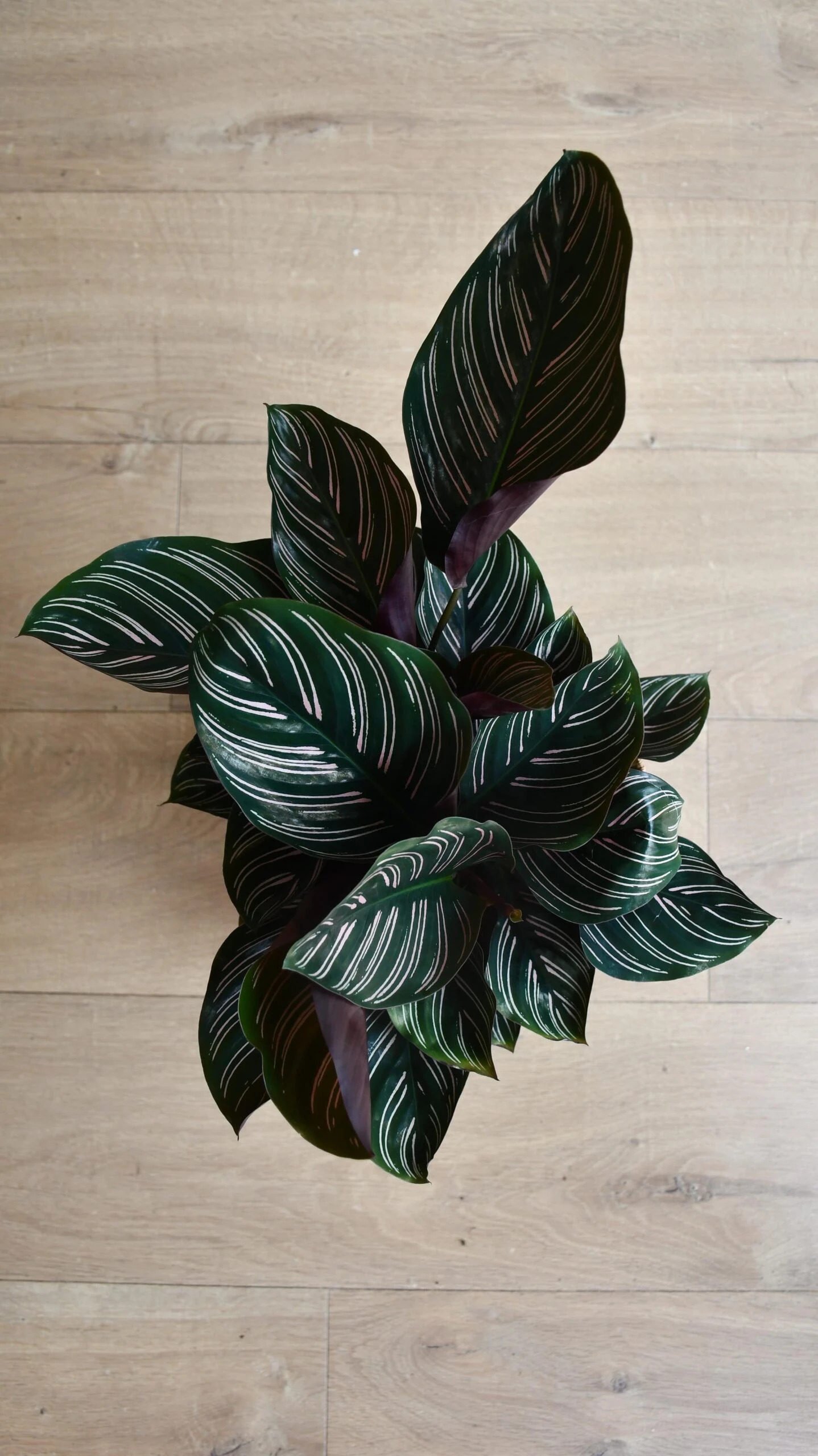 Calathea Sanderiana Light Requirements: Place your Pinstripe Calathea in a location with bright, indirect light. It thrives in moderate to high light conditions but must be shielded from direct sunlight to prevent leaf scorch. Optimal spots include areas near north or east-facing windows.
