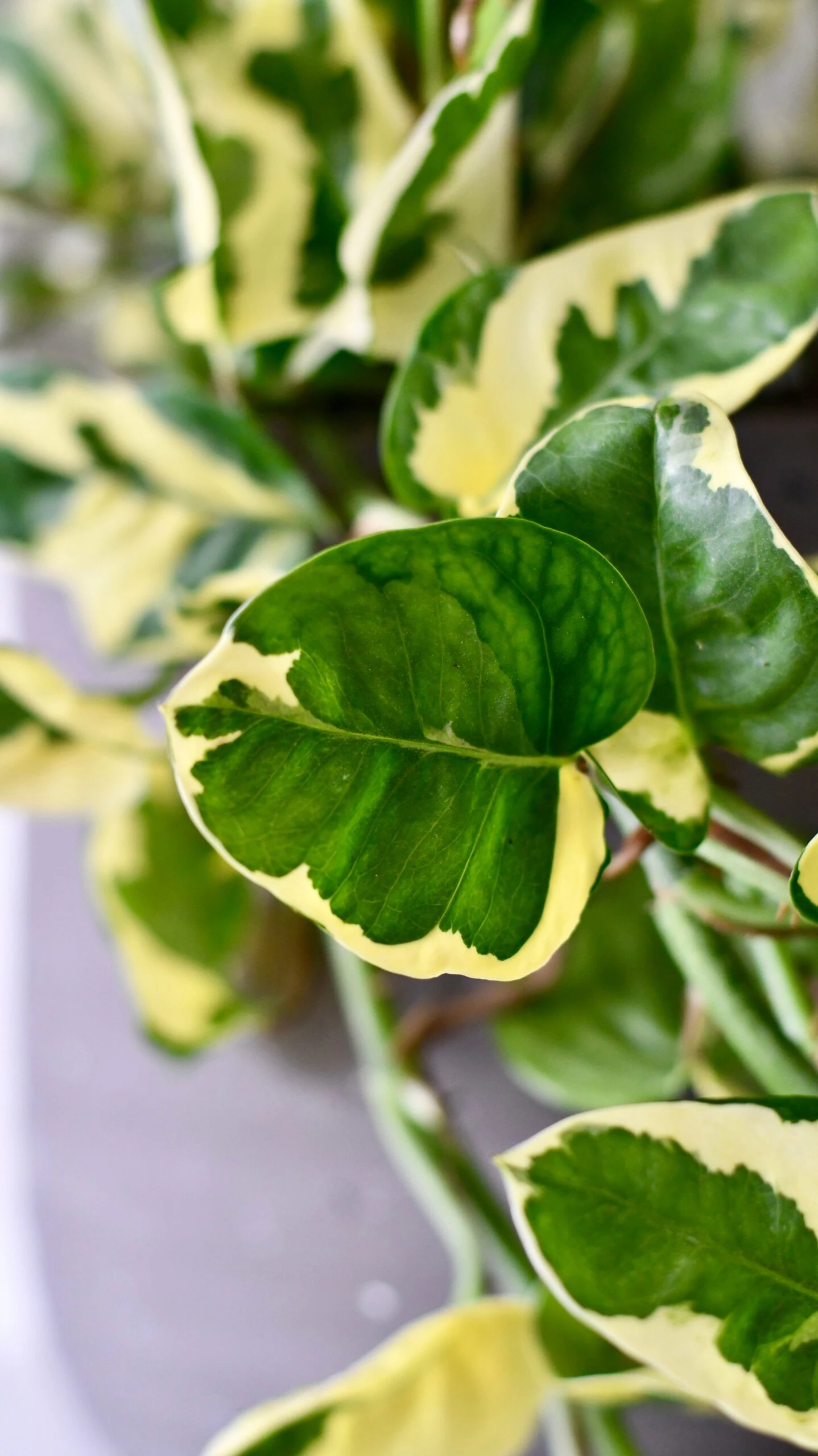 Soil and Potting: Use a well-draining potting mix that retains some moisture. A mixture of potting soil, peat moss, and perlite or orchid bark works well for Variegated Devil’s Ivy. Repotting may be necessary when the plant outgrows its current container.