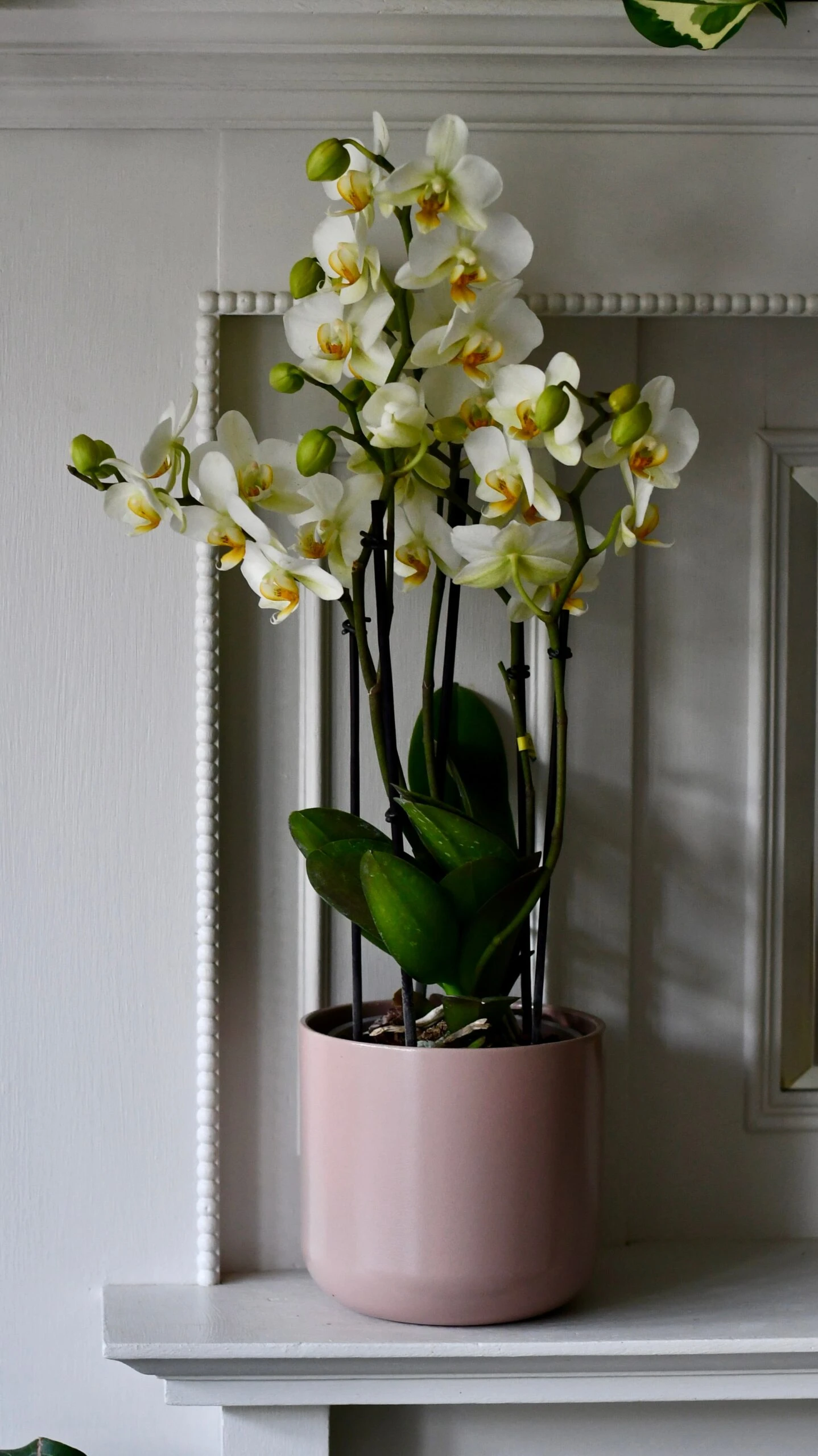 White Phalaenopsis Orchids make fabulous houseplants due to their low maintenance requirements and stunning visual appeal. They prefer bright, indirect light and moderate humidity levels. They do not require frequent watering and thrive in well-draining potting soil. These orchids can bloom up to twice a year and produce long-lasting and show-stopping blooms in shades of white and cream.