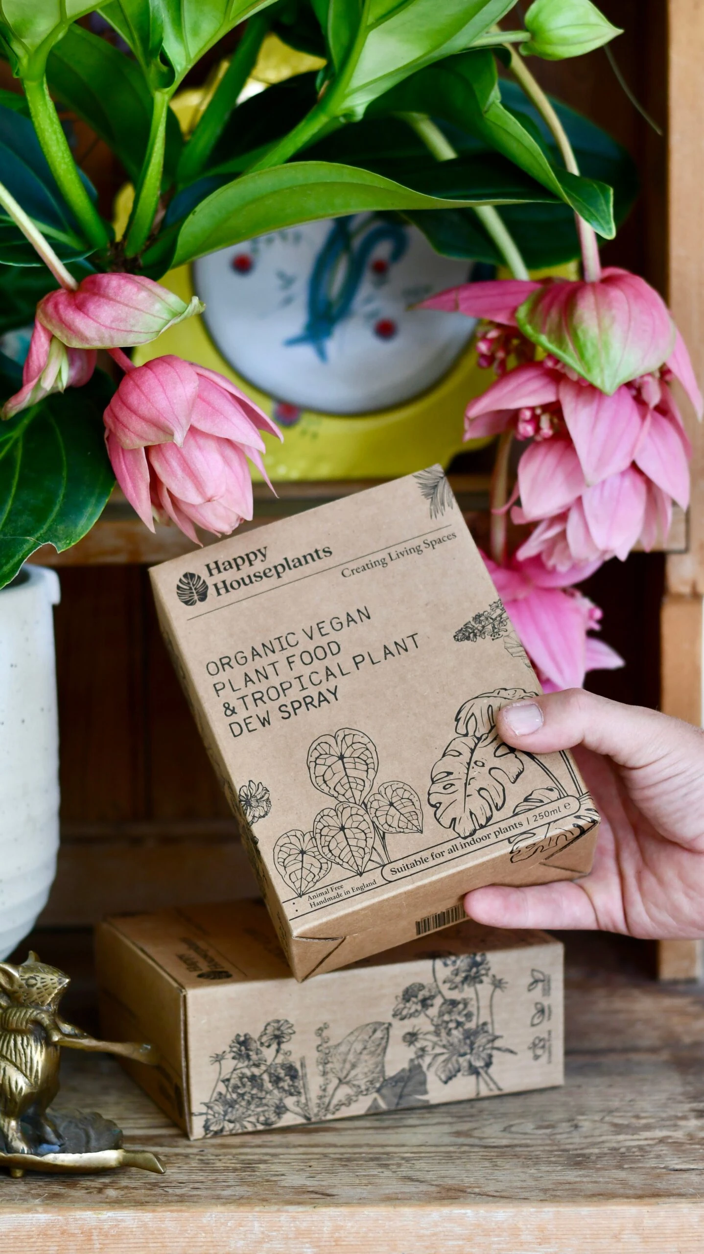 Welcome to Happy Houseplants, where you’ll find the best houseplant food in the UK! When it came to developing our original Happy Houseplants’ Organic Tropical Plant Food and Dew, we decided not to tinker with it too much, so you’ll find no chemical supplements in this 100% cruelty-free vegan Gift Set. Our Organic Tropical Plant Food and Dew Gift Sets are the perfect indoor houseplant food for plant lovers who seek natural and organic solutions to care for their green companions.