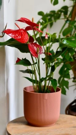 Anthurium are native to tropical rainforests, they are actually epiphytes, so in their native habitat grow on other plants and trees; however, they can also grow on the ground. They will love either being placed in a pot on the floor or on a sideboard – although they will ultimately grow quite large.