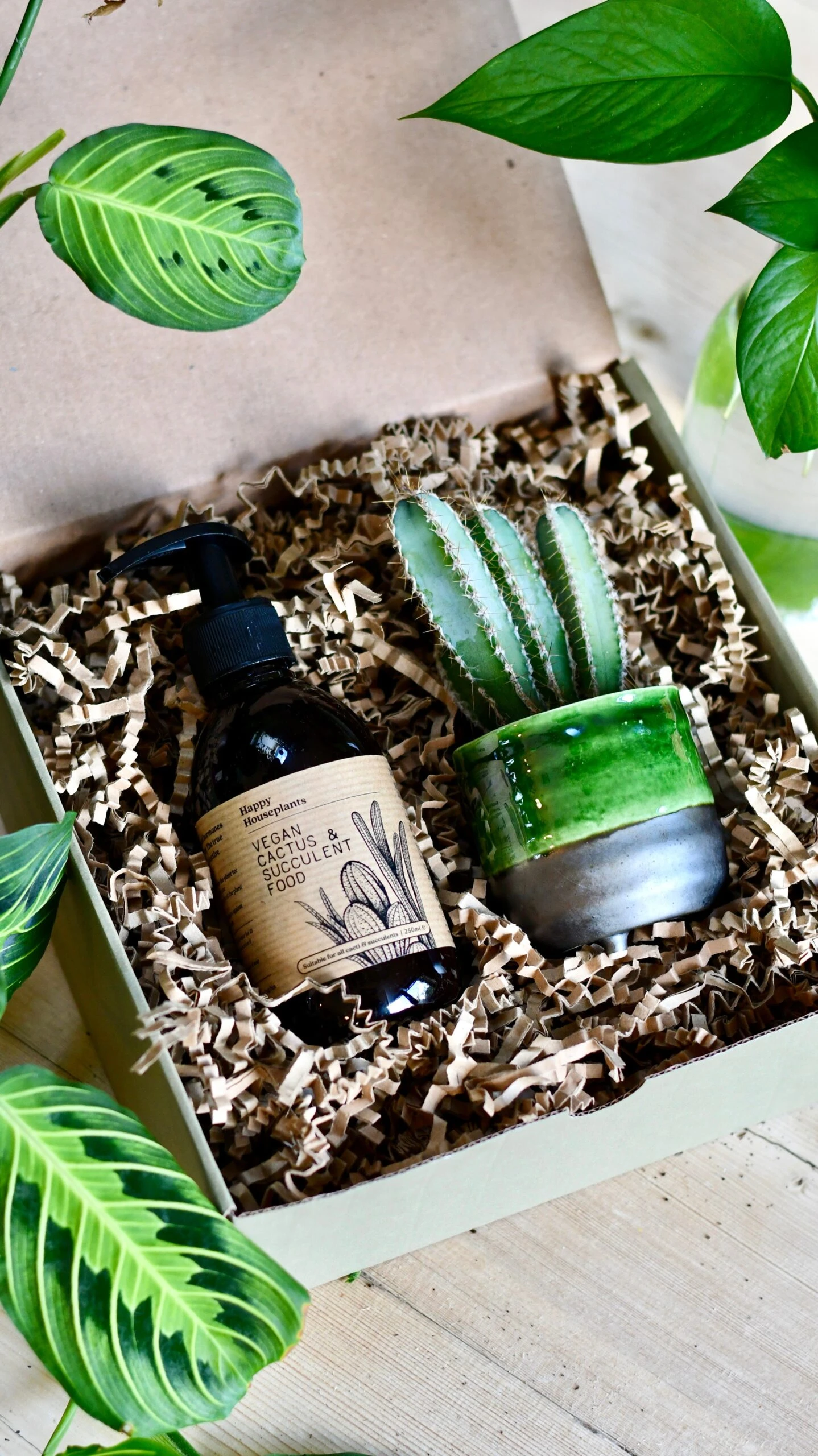 A beautiful cactus gift box for anyone who loves Cactus and Succulents, this gift set has a baby Cactus in a Jade ceramic pot with feet and a bottle of our original Happy Houseplants’ Vegan Cactus & Succulent Food. Houseplants delivered.