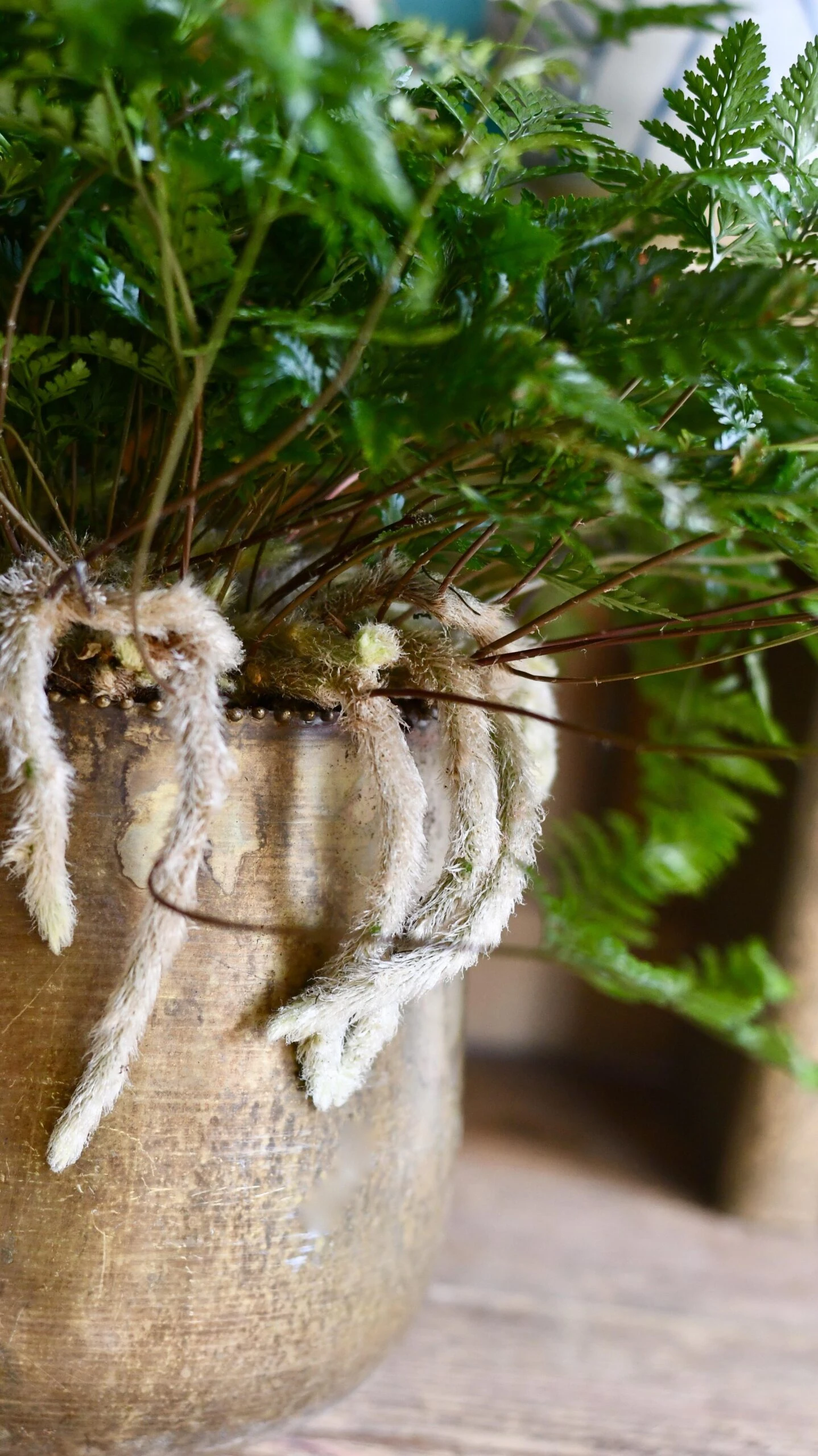 Humata tyermannii is a native of Fiji and likes a warm, humid atmosphere, but nothing too hot. Think shower room or warm kitchen in a bright spot but away from the direct sun. Think of it hiding on the forest floor!