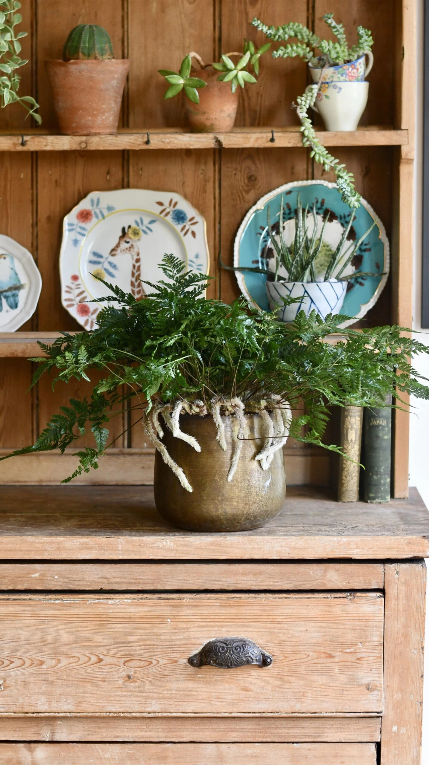 Ferns are wonderful and very much in fashion. We love this because it conjures up images of the lush rainforest floor. If you’re looking for small houseplants that are easy to care for and you want to bring the tropical rainforest experience to your home, try this graceful little fern, Humata tyermannii, which is very refreshing to look at.
